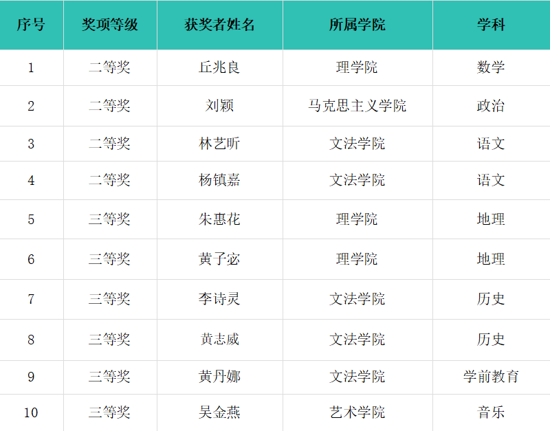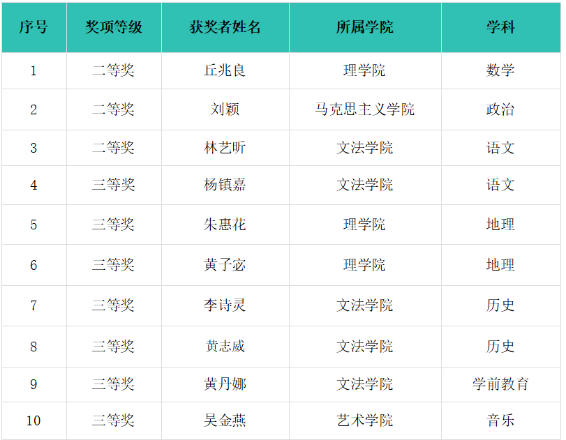 近日,由广东省教育厅主办、华南师范大学承办的第十三届广东省本科高校师范生教学技能大赛获奖名单公布,我校师范生表现优异,共荣获各类奖项10项,包括二等奖3项、三等奖7项,创下历年参赛最佳成绩。具体获奖情况如下: