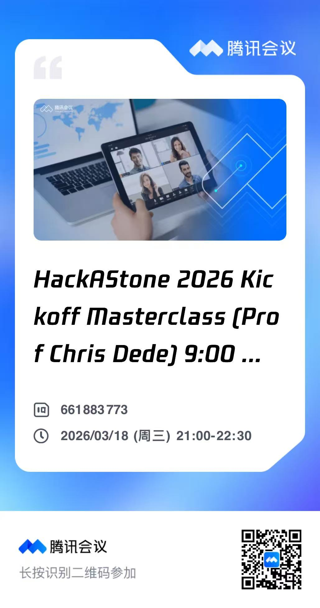 参与方式:线上,腾讯会议号:661 883 773。限额100人,请有意向参与的老师尽快通过腾讯会议扫码完成报名登记,确保获取参会权限。