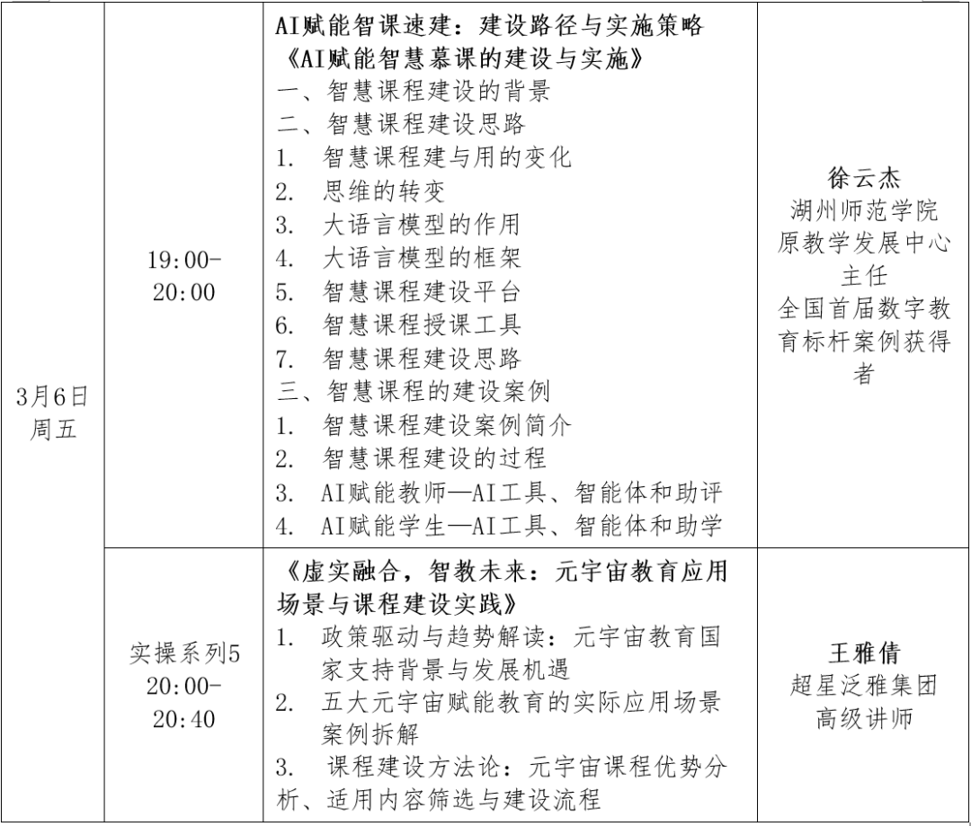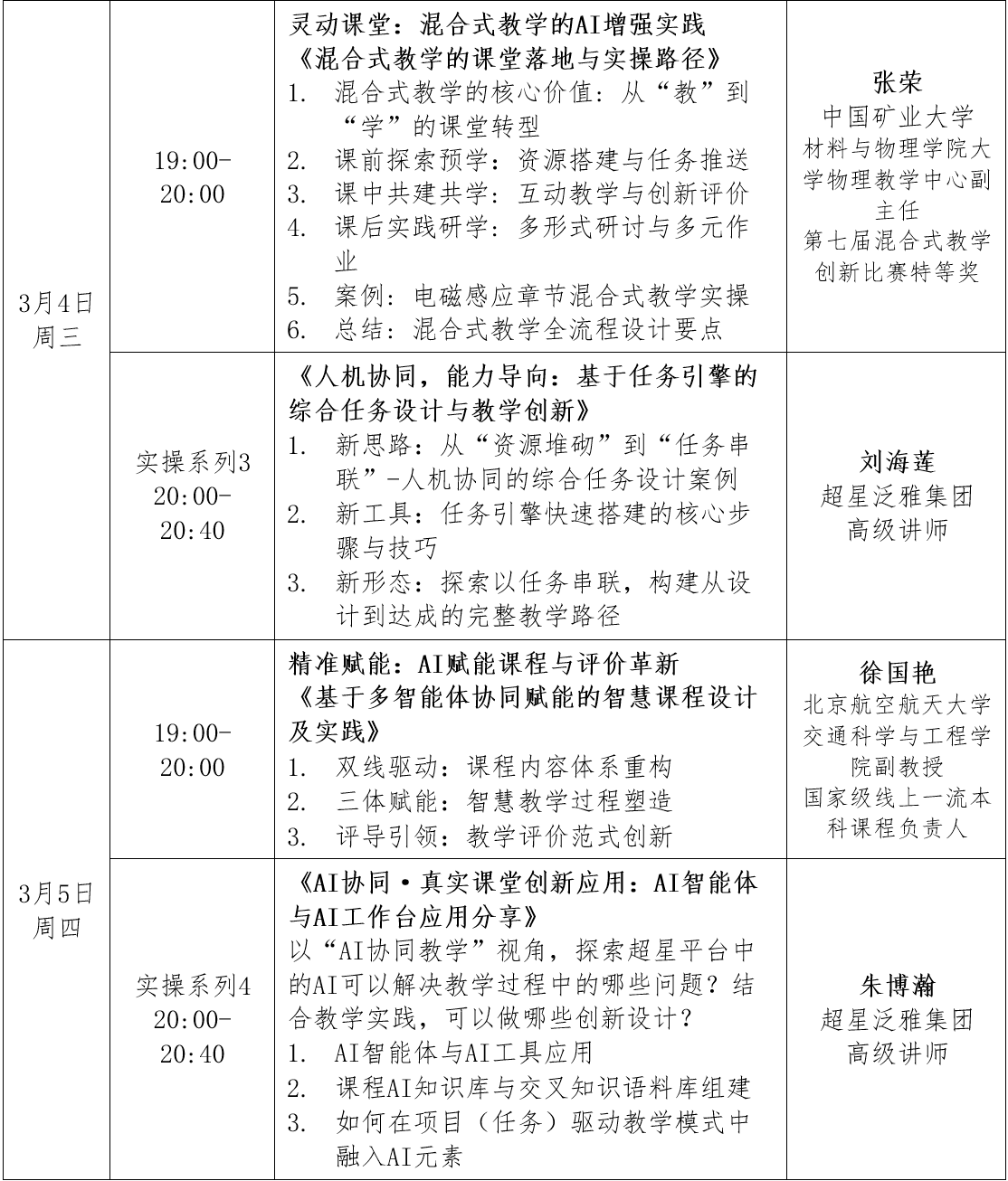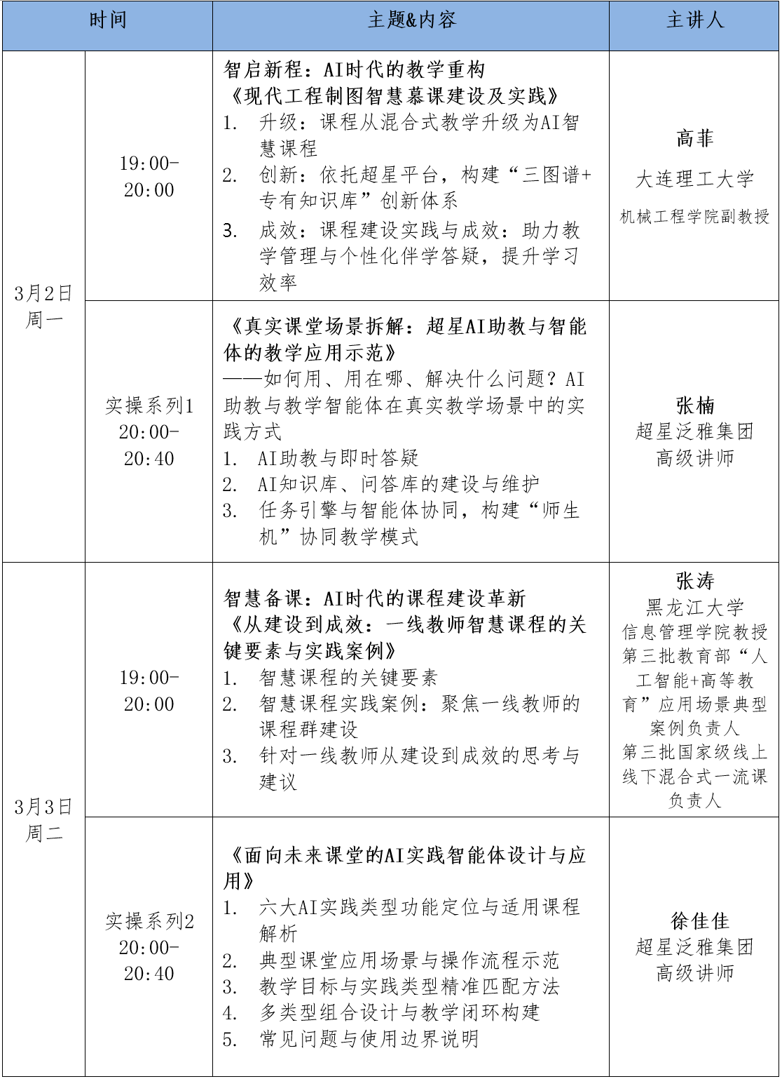 为深入贯彻落实《教育强国建设规划纲要(2024–2035年)》及《人工智能+教育》行动计划,全面推进高等教育数字化转型与智慧教学深度融合,加速人工智能在高校教学中的创新应用,超星教师发展研究院于2026年春季开学之际,面向全国高校教师举办公益直播周活动,以“智启师道 春育未来”为主题,旨在通过AI技术全方位赋能教学场景,助力教学质量与效率全面提升。直播于3月2日至3月6日持续开展,诚邀各位老师参与,共同探索未来教学新路径。